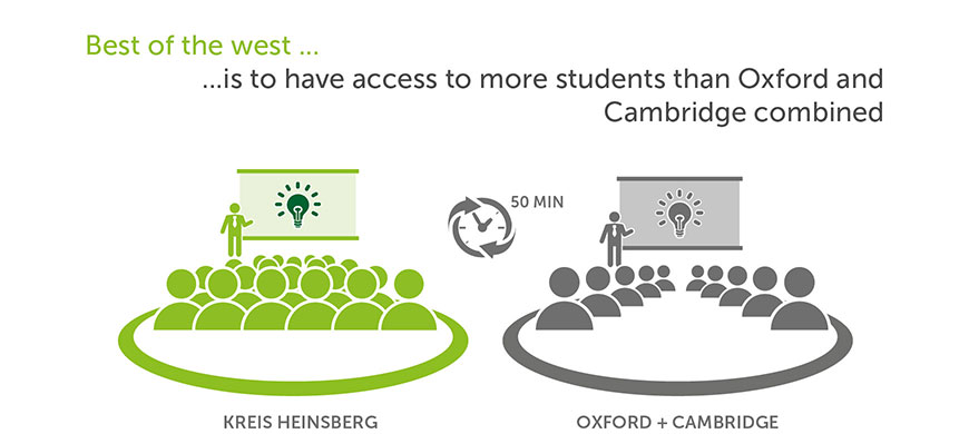 Admit it: This fact comes as a surprise to you. Within 50 minutes, 135,000 students can reach your company location in the district of Heinsberg. The universities in Aachen, Düsseldorf, Cologne, Juelich, Mönchengladbach, Maastricht and Lüttich can be reached in a travel time that is less than the time it takes to cross some large cities. The region‘s international prestigious universities specialise in technical subjects, providing students and graduates that can give your business a real competitive advantage in the Heinsberg district. The WFG (business development corporation) in association with their network partners and university contacts will help you to develop this potential for your company.
